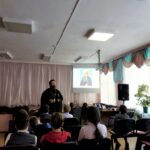 В начале встречи священник разъяснил учащимся о значении и понятии таких слов как монах, аскетический подвиг, что такое молитва, рассказал ребятам историю жизни преподобного, его значимости как личности — исторической, политической, нравственных ценностей.